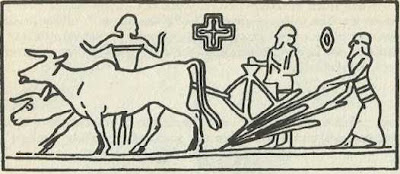 (Bild ovan: På en i Nippur påträffad sigillcylinder vid arkeologiska utgrävningar har avbildats ett par plöjande män som vördnadsfullt ser upp mot Den tolfte planeten (åskådliggjord genom kors-symbolen), som syns på himlen).
