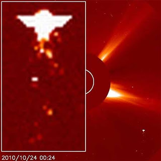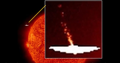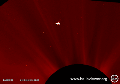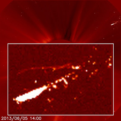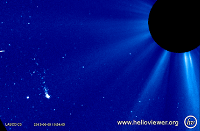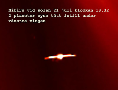 (Bild ovan ur solteleskopet Helioviewer tagen 26 juli 2013. Nibiru passerar tätt invid solen och i svansen kan anas planeter med mera som ingår i minisolsystemet )