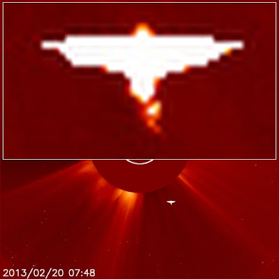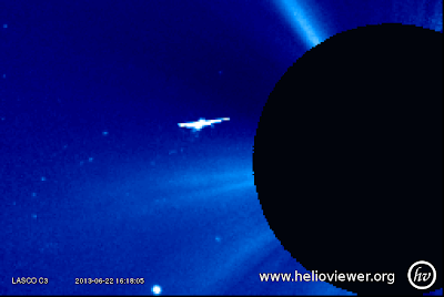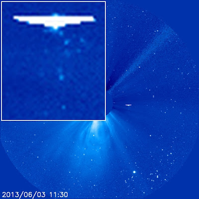 (Bild ovan från solteleskopet Helioviewer 24/7 2013 klockan 21.24, objektet framträder strax under solen och dess planeter syns bakom det liggande "korset")