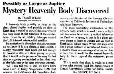 Ett antal år längre fram sköts ett bättre infrarött teleskop upp och då "satte man i halsen" enligt en källa över det man upptäckte att historiska berättelser om en 10:e planet , en röd jätteplanet stämde. Saken tystades de följande åren ned och inget mera skrevs i media.