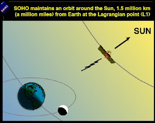 (Bild ovan: Placering av NASA´s solsatellit SOHO i jämförelse med Jorden)