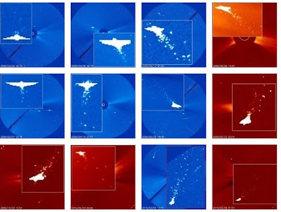 (Bild ovan: Hämtar ur NASA´s solteleskop Helioviewer, här ses minisolsystemet "Nibiru" passera vid solen men en svans av planeter, månar samt meteoriter och asteorider i släptåg)