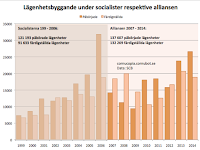 Verkligheten är att det både påbörjats och färdigställts fler lägenheter i flerbostadshus under alliansens åtta år 2007 - 2014 än (s)ocialisternas föregående åtta år 1999 - 2006. Under socialisterna påbörjades det 121 193 lägenheter och färdigställdes 91 663. Under alliansen var siffran 137 607 påbörjade och 132 269 färdigställda.